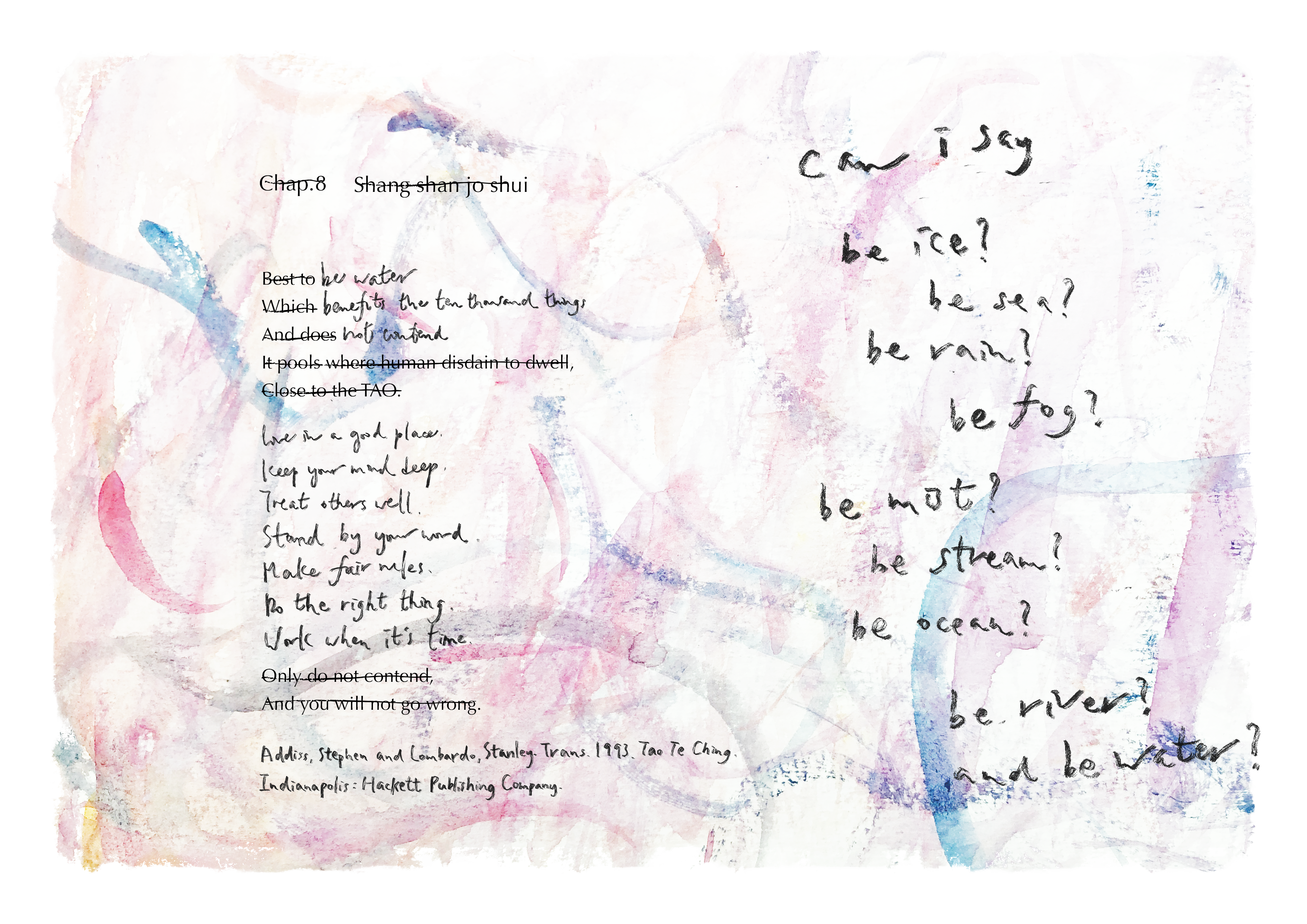 ‘Why do you read Daodejing in translation?’ I was asked. I decided to experiment with language thinking by doing multiple forms of translation. I put the first two verses of Daodejing in Ancient Chinese, Cantonese transliteration, and English translation in my text. Following artist André Masson’s concept of automatic drawings, I let the charcoal and watercolour brush wander without conscious control. They have some affinities with ink-wash paintings, which are rhythmic, and emphasise spontaneity, simplicity, and self-expression. The graphic slides will show how I arrived at an idea by writing the translated language, drawing lines across uninspired, human-centric thinking, and creating spaces around words.